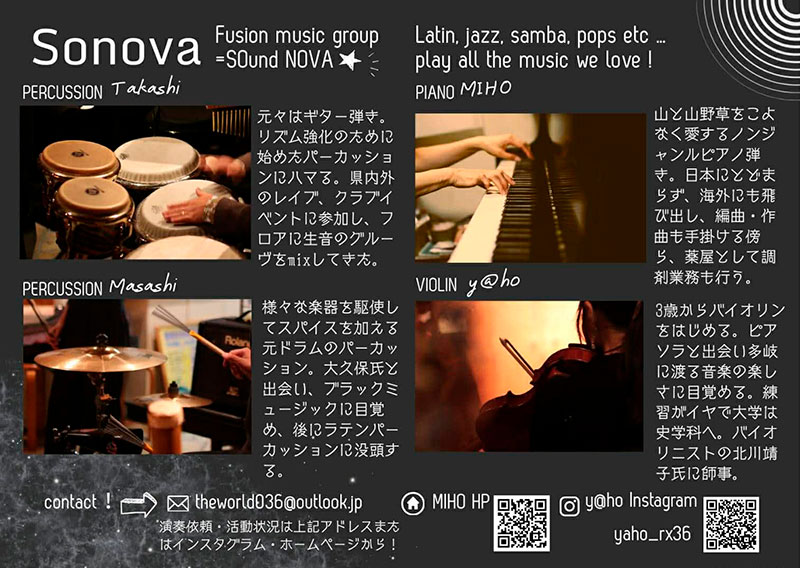 2024年夏より始動。ラテン音楽を中心に独自の編成かつ編曲で、わくわくする音楽作りに取り組む。
